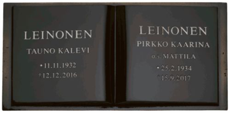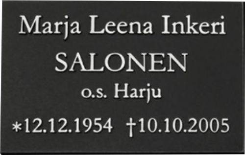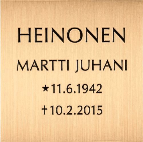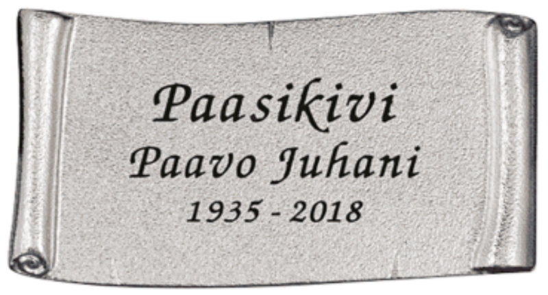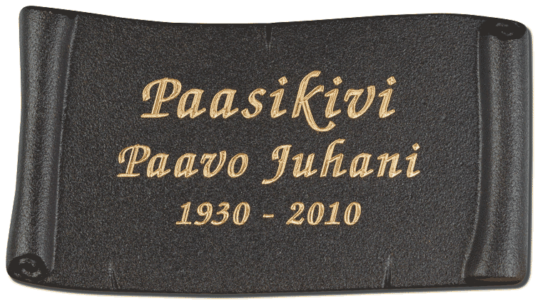 Lisänimikaiverruksen sijaan on mahdollista asentaa muistolaatta jo olemassa olevaan hautakiveen. Myymme ja asennamme korkealaatuiset hautausmaakäyttöön tarkoitetut muistolaatat joko kaiverrettuna tai kohokirjaimin. Muistolaattoja tarjoamme erittäin kattavan valikoiman eri koko- ja hintaluokissa. Pääyhteistyökumppaninamme toimii suomalainen M.J. Paasikivi Oy joka omaa pitkän kokemuksen korkealaatuisten, suomalaiseen hautakivikulttuuriin ja -tyyliin sopivien muistolaattojen valmistuksesta. Valikoimastamme löytyy myös muiden valmistajien korkealaatuisia valettuja muistolaattoja.
